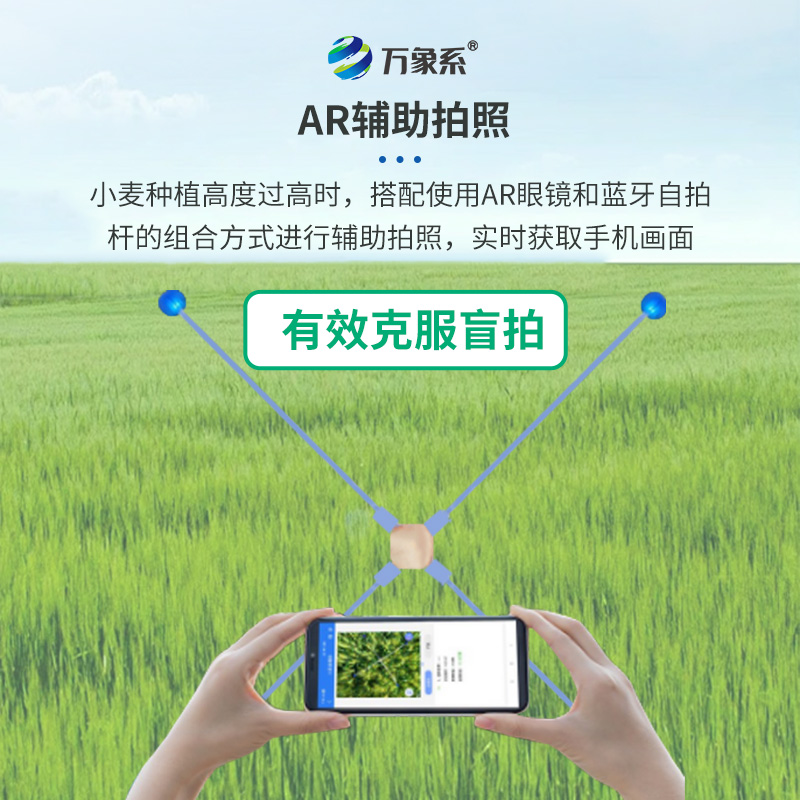 3、AR輔助拍照,有效克服盲拍:小麥種植高度過(guò)高時(shí),搭配使用AR眼鏡和藍(lán)牙自拍桿的組合方式進(jìn)行輔助拍照,實(shí)時(shí)獲取手機(jī)畫面。