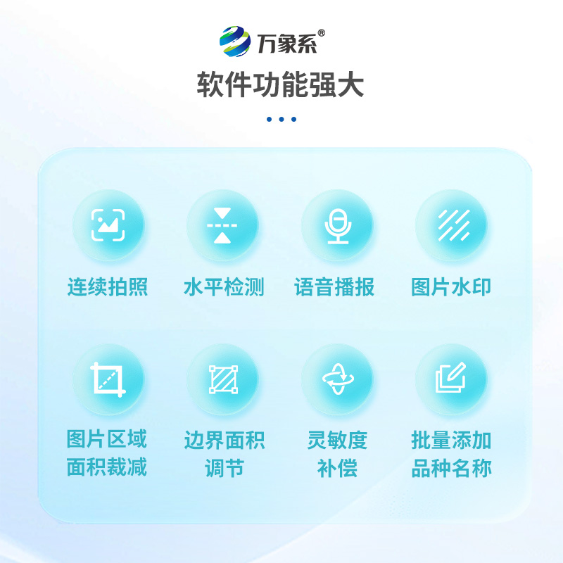 5、軟件功能強(qiáng)大:軟件具有連續(xù)拍照、水平檢測(cè)、語(yǔ)音播報(bào)、圖片水印、圖片區(qū)域面積裁減、遮擋率、邊界面積調(diào)節(jié)和靈敏度補(bǔ)償、批量添加品種名稱等功能。